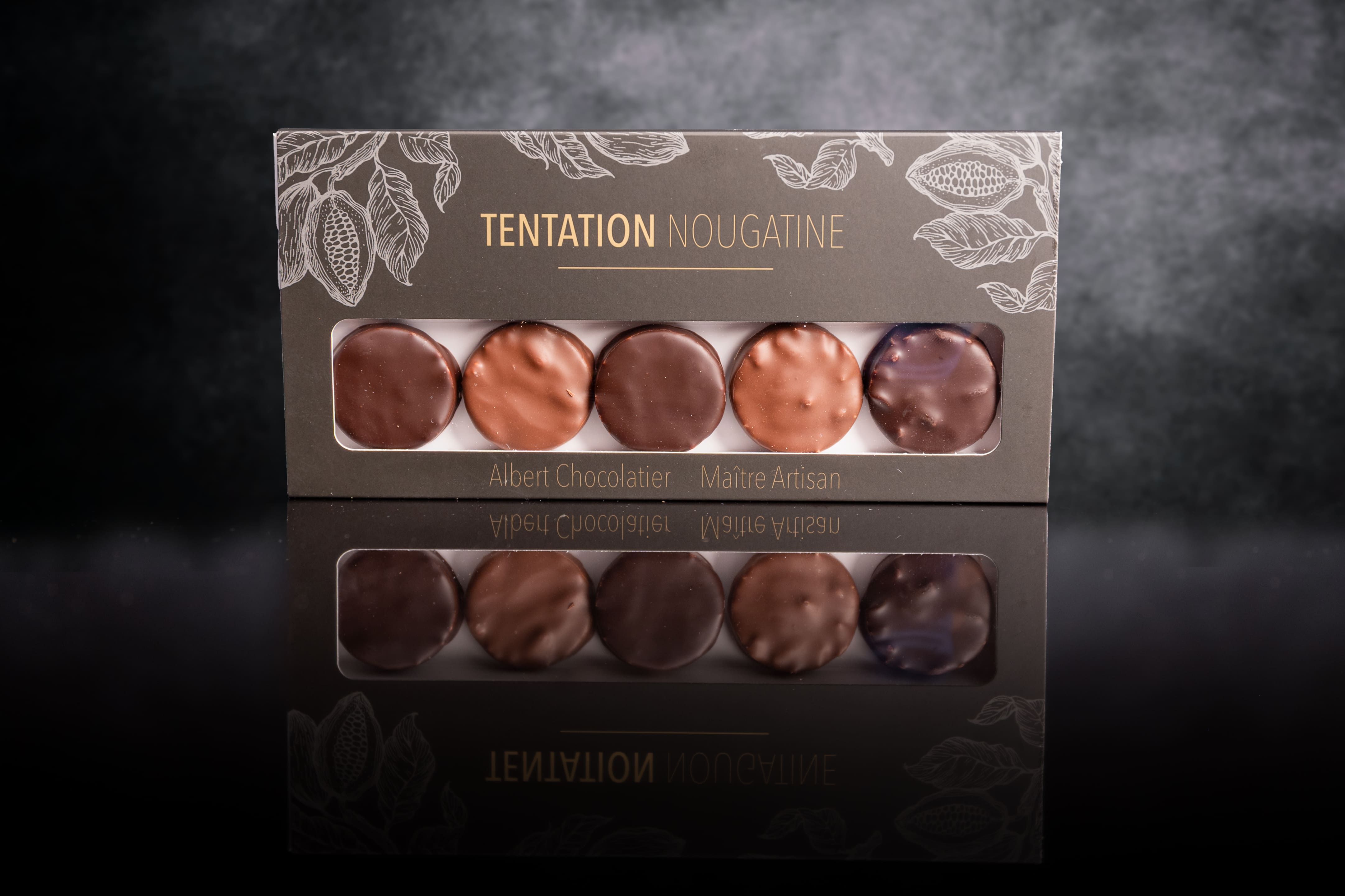 Nos tentations nougatine sont enrobées de chocolat noir et de chocolat au lait avec de la nougatine croustillante aux amandes, noisettes et pistache.
